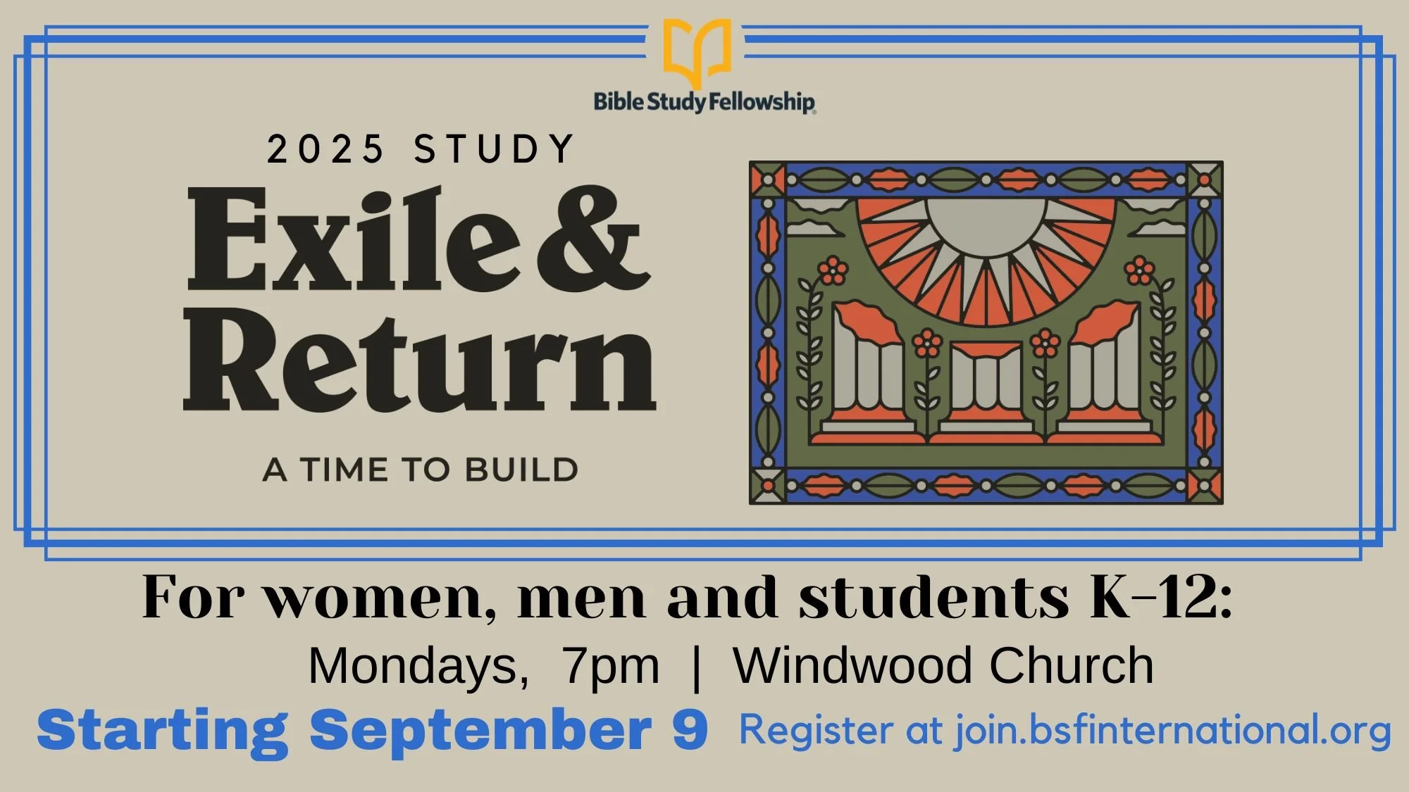 Back to All Events BSF Mens & Womens Monday, September 8, 2025 6:00 PM 10:00 PM Google Calendar ICS Click the picture above to register