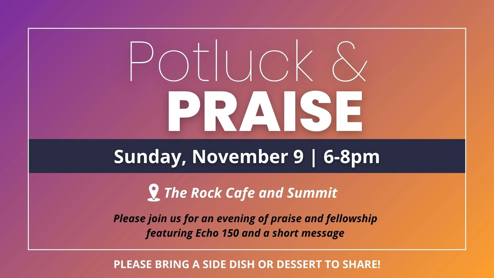 Back to All Events Potluck & Praise Thursday, October 16, 2025 1:30 PM Saturday, November 8, 2025 11:30 PM Google Calendar ICS