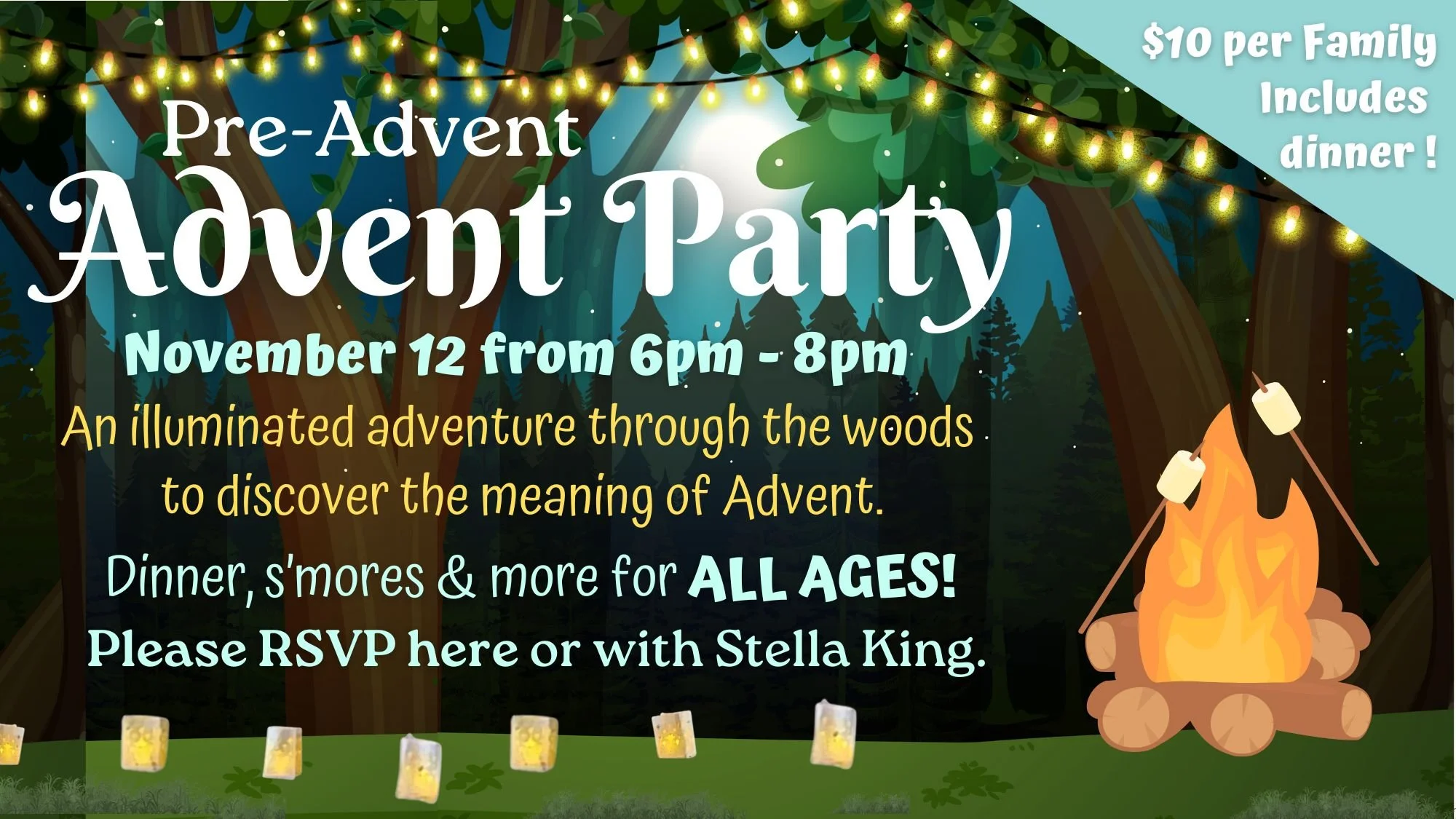 Pre-Advent Advent Party Thursday, October 9, 2025 2:30 PM Wednesday, November 12, 2025 6:30 PM Google Calendar ICS Click the picture for more information